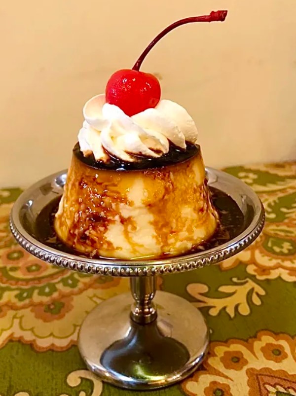 コッペパンやワッフル、クラシカルプリンなどの手作りのスイーツが人気です。アンティークの家具や食器、壁紙などがレトロな雰囲気を演出しています。